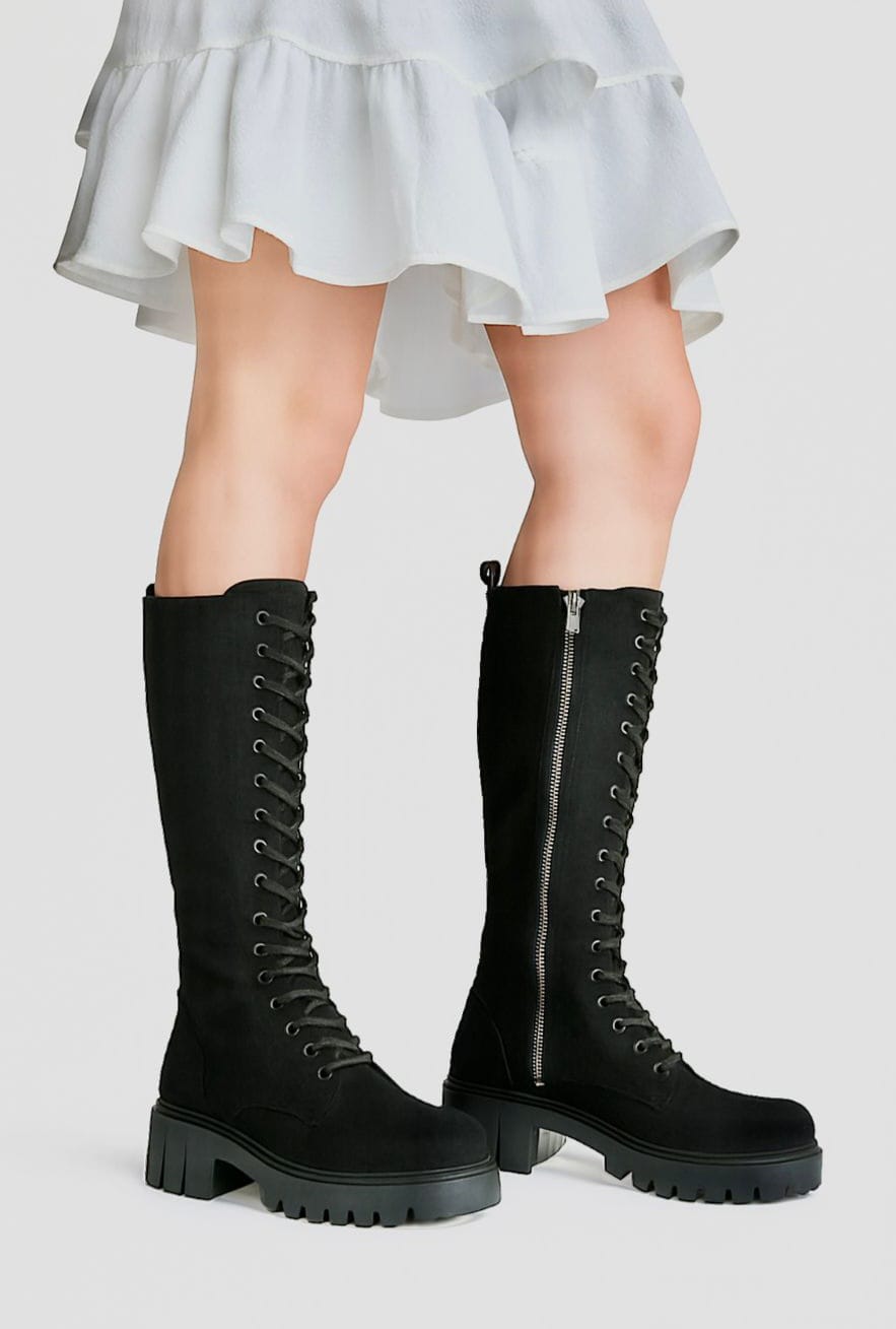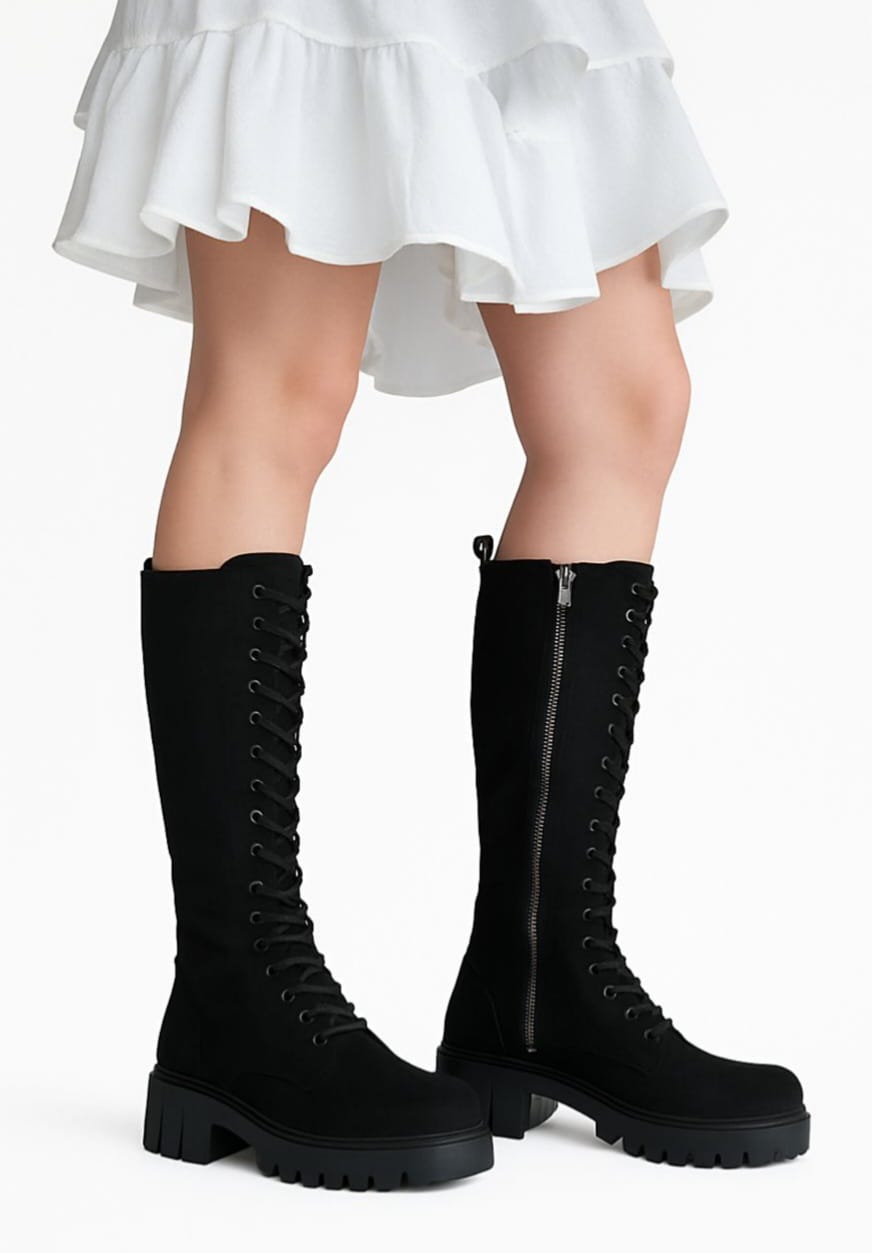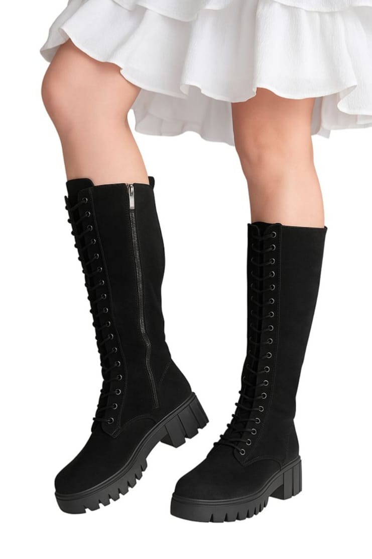 Cizme damă negre până la genunchi cu șiret și fermoar lateral, toc 3 cm