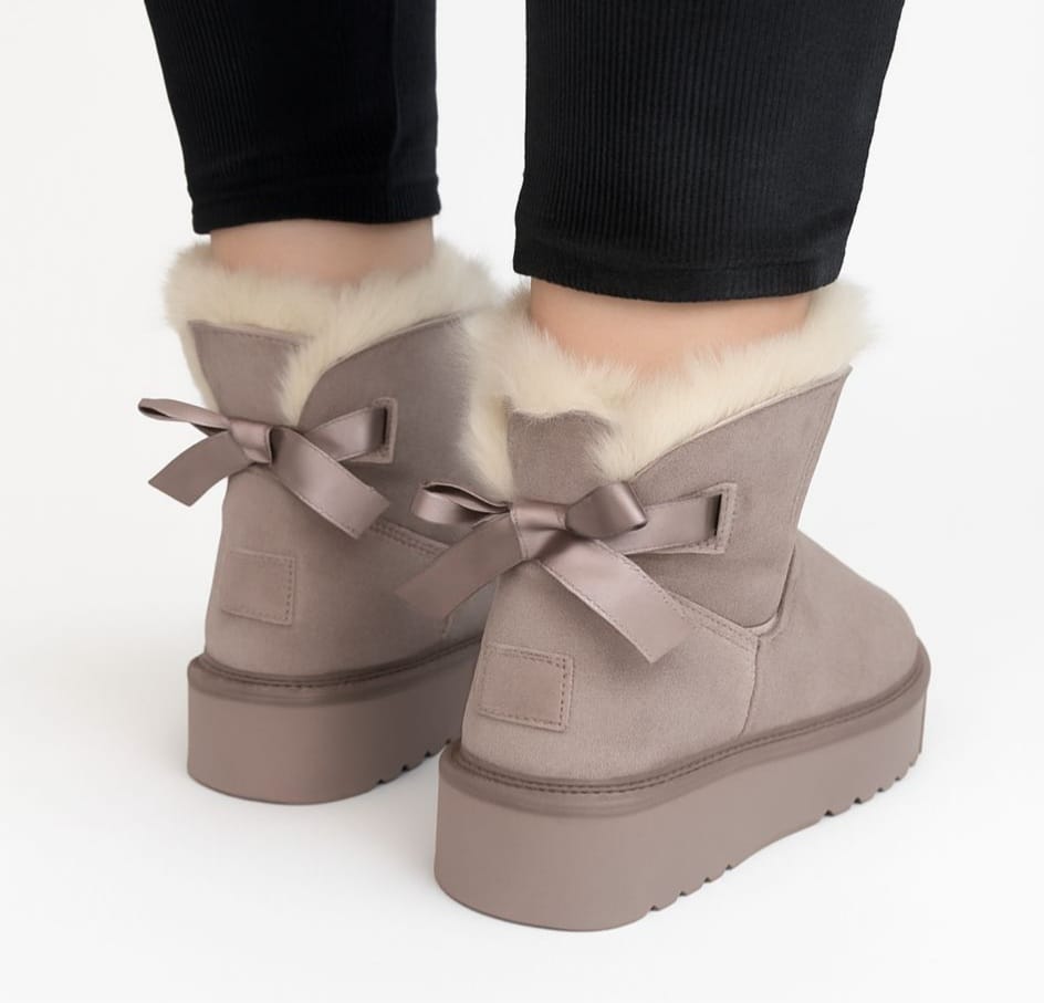 Ghete îmblănite damă bej taupe cu fundițe la spate și talpă groasă – 3/4 cm