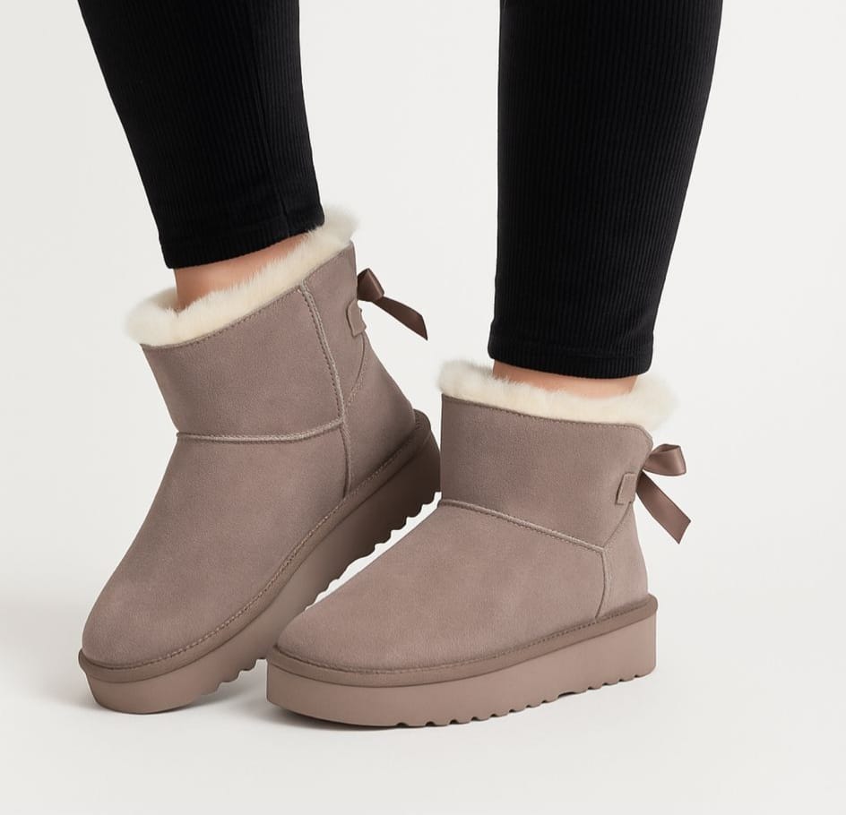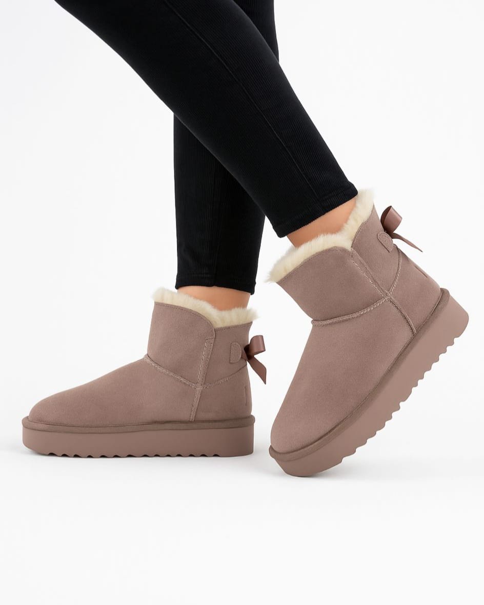 🤎 Adaugă un strop de eleganță ținutelor de iarnă cu aceste ghete îmblănite bej taupe, decorate cu fundițe satinate la spate 🎀. Realizate din piele întoarsă naturală, au un interior moale cu blană sintetică, perfect pentru confort și căldură în sezonul rece ❄️.