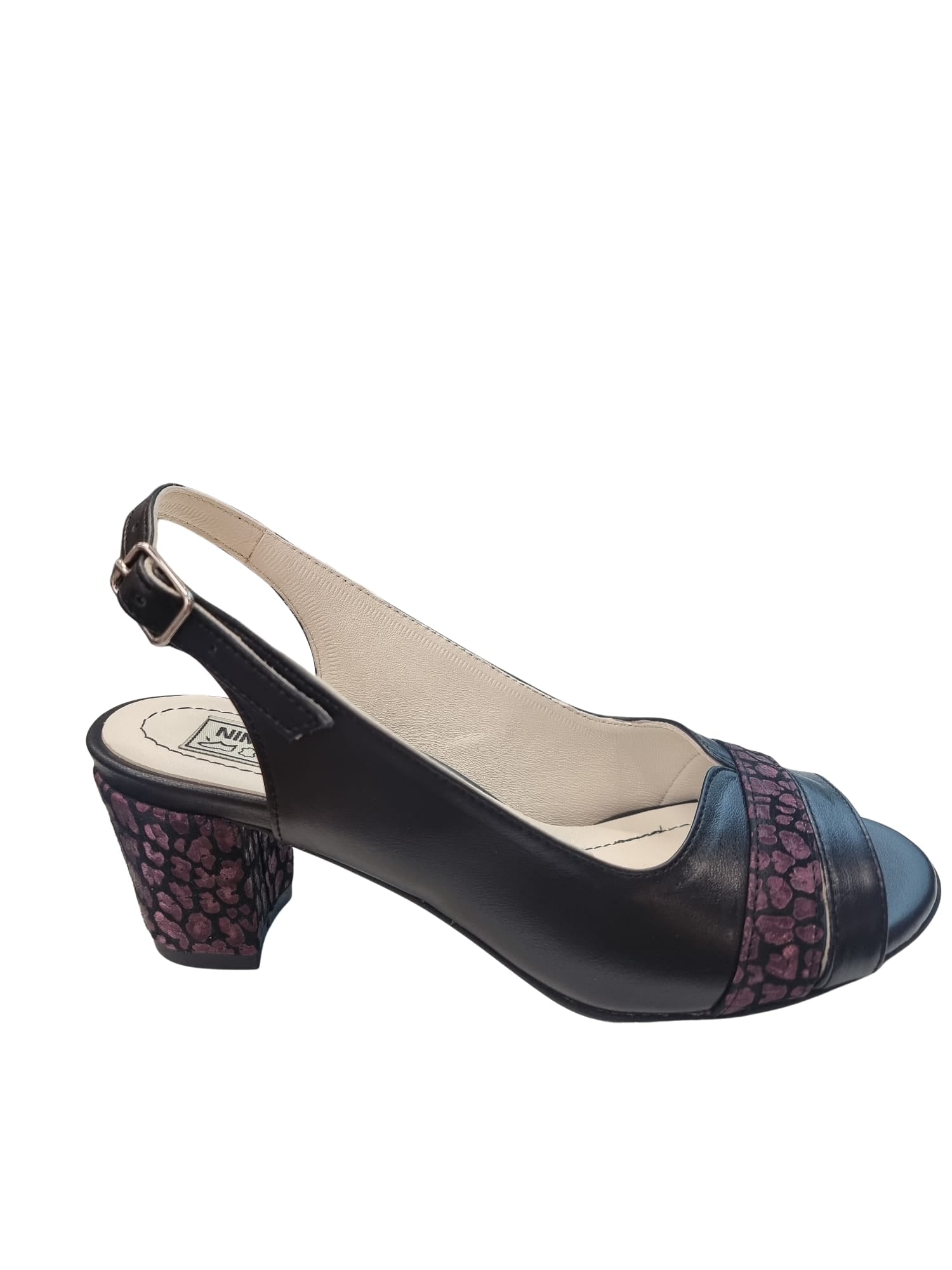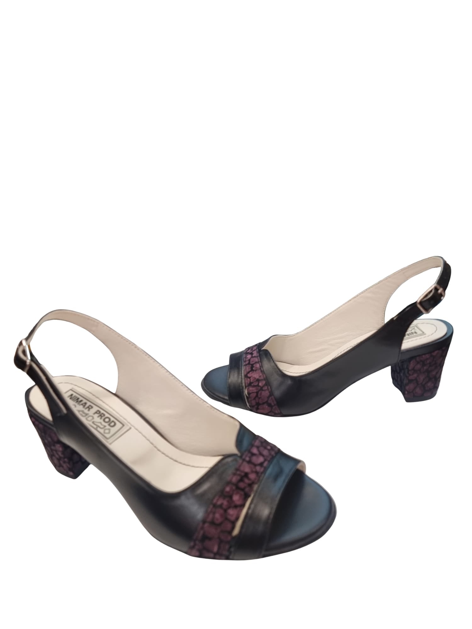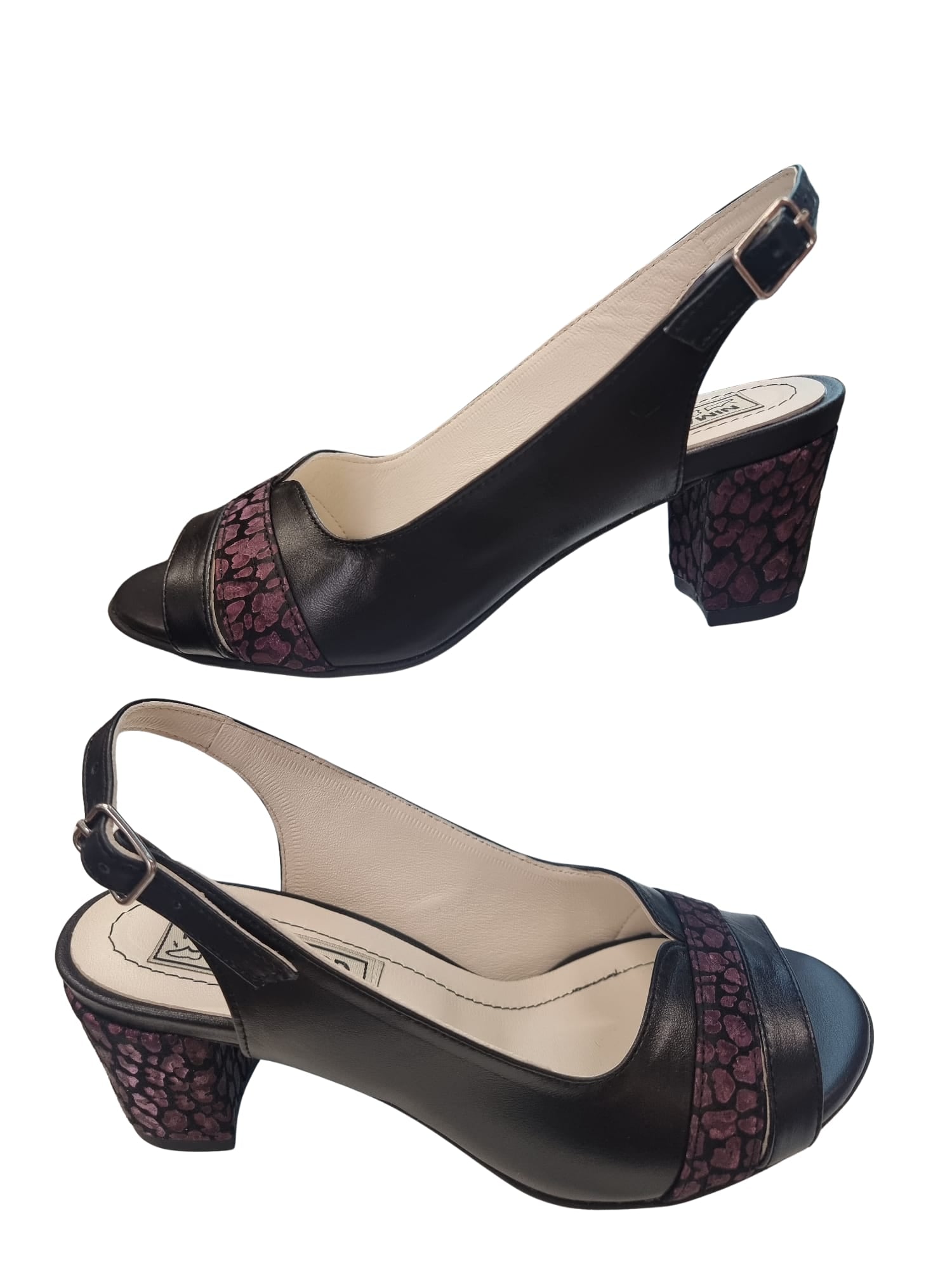 Descoperă sandalele din piele naturală, cu toc gros de 5 cm – alegerea perfectă pentru confort și stil la birou sau la evenimente! 👡 Realizate manual în România, aceste sandale combină eleganța negrului clasic cu un detaliu geometric mov pe toc și baretă. Sistemul reglabil cu cataramă oferă susținere optimă, iar pielea naturală premium garantează rezistență și respirabilitate. 🔝