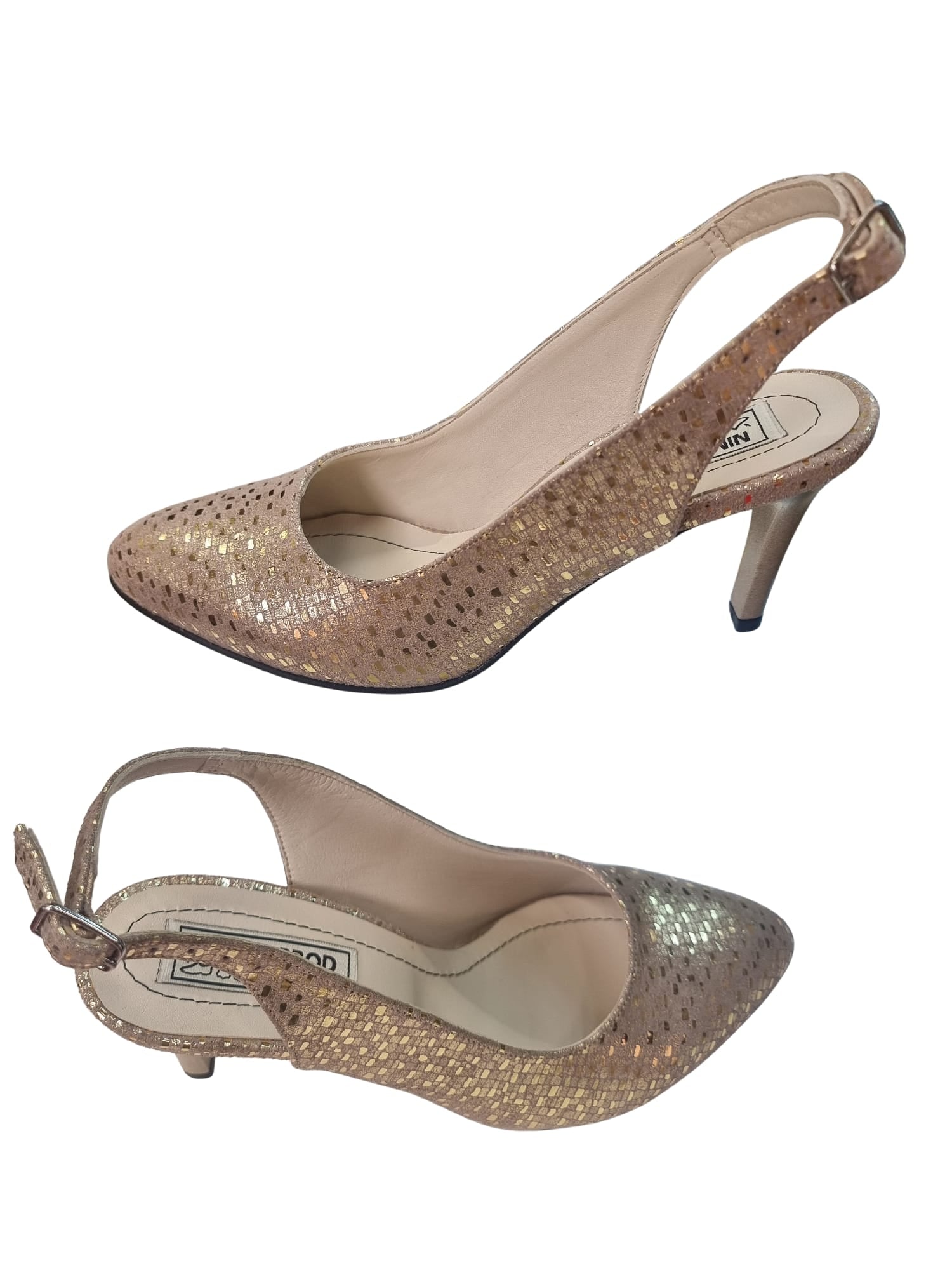 ✨ Completează-ți ținuta elegantă cu aceste sandale slingback aurii din piele naturală, perfecte pentru evenimente speciale, petreceri sau ocazii de seară. Designul cu model discret metalizat oferă un efect de strălucire sofisticat, iar tocul de 7 cm îți asigură un echilibru ideal între confort și eleganță.
